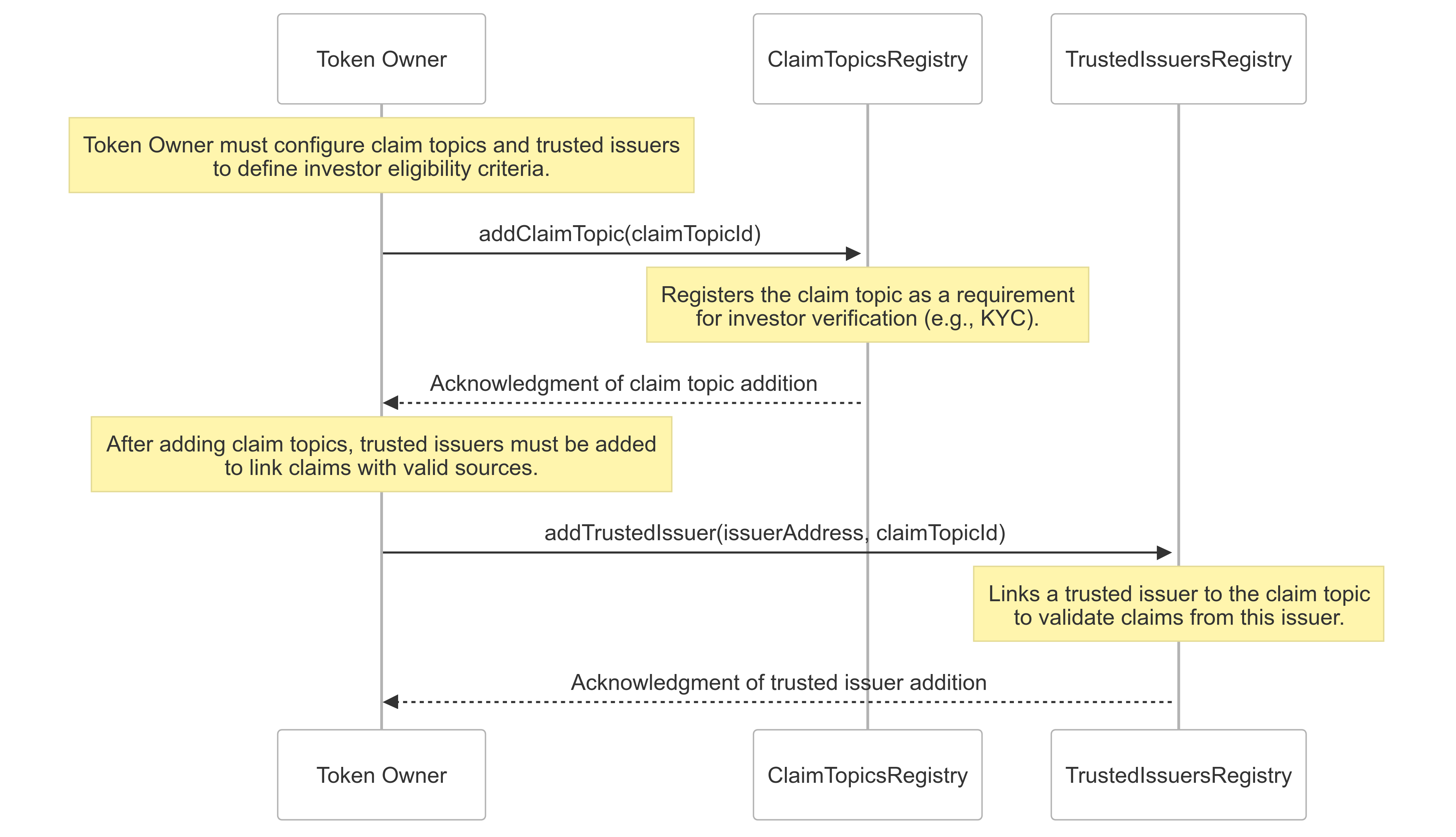 To define investor eligibility criteria for an ERC-3643 token, the token owner must add claim topics and trusted issuers. This process ensures that investors are verified according to the framework standards. The following sequence diagram illustrates this process: